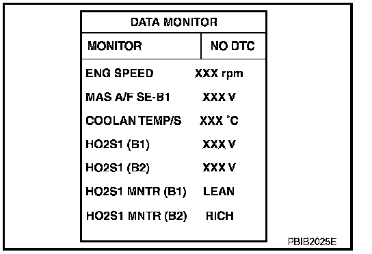 - "HO2S1 MNTR (B1)/(B2)" in "DATA MONITOR" mode changes from "RICH" to "LEAN" to "RICH" more than 5 times in 10 seconds.