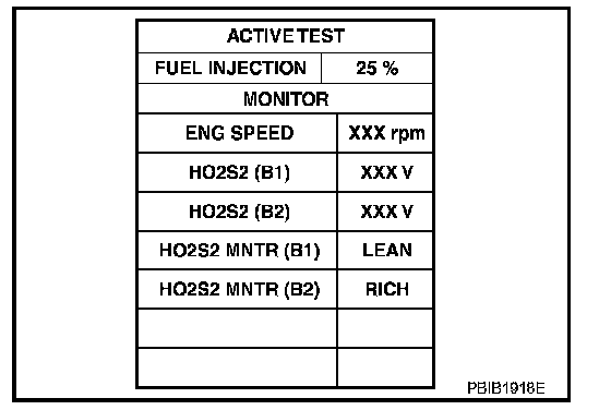 6. Check "HO2S2 (B1)/(B2)" at idle speed when adjusting "FUEL INJECTION" to ±25%.