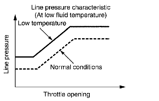 When the A/T fluid temperature drops below the prescribed temperature, in order to speed up the action of each friction element, the line pressure is set higher than the normal line pressure characteristic.
