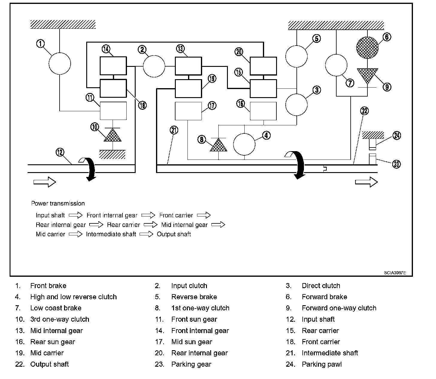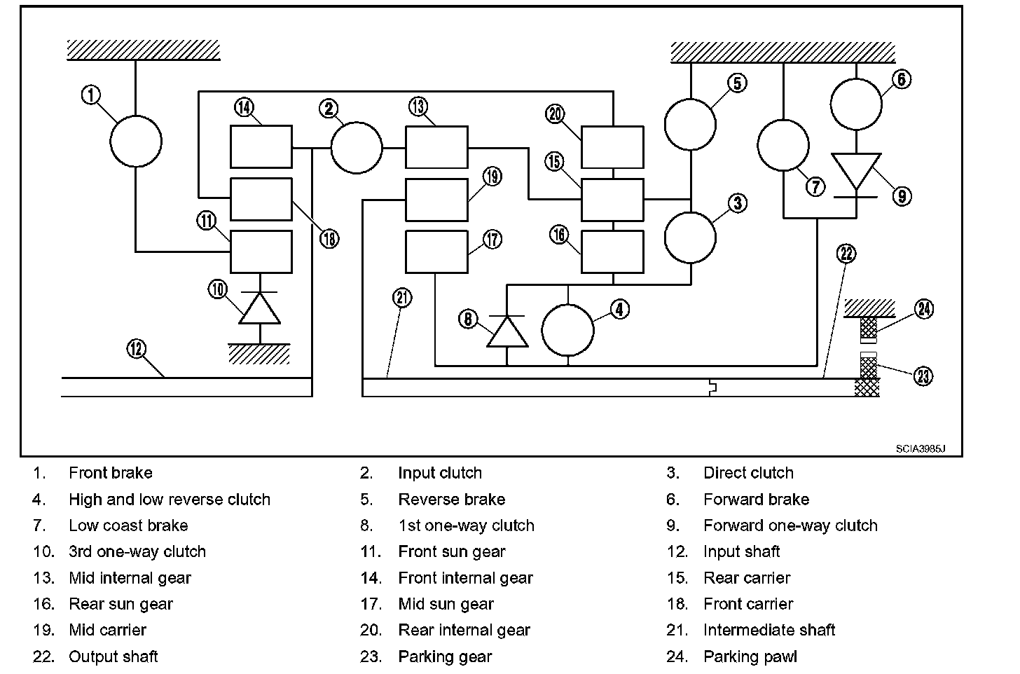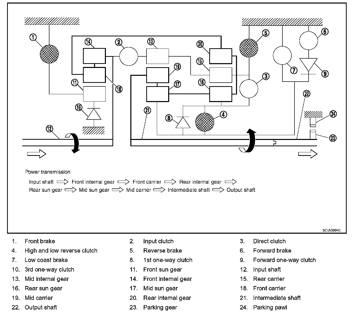 ^ The forward brake and the forward one-way clutch regulate reverse rotation of the mid sun gear.