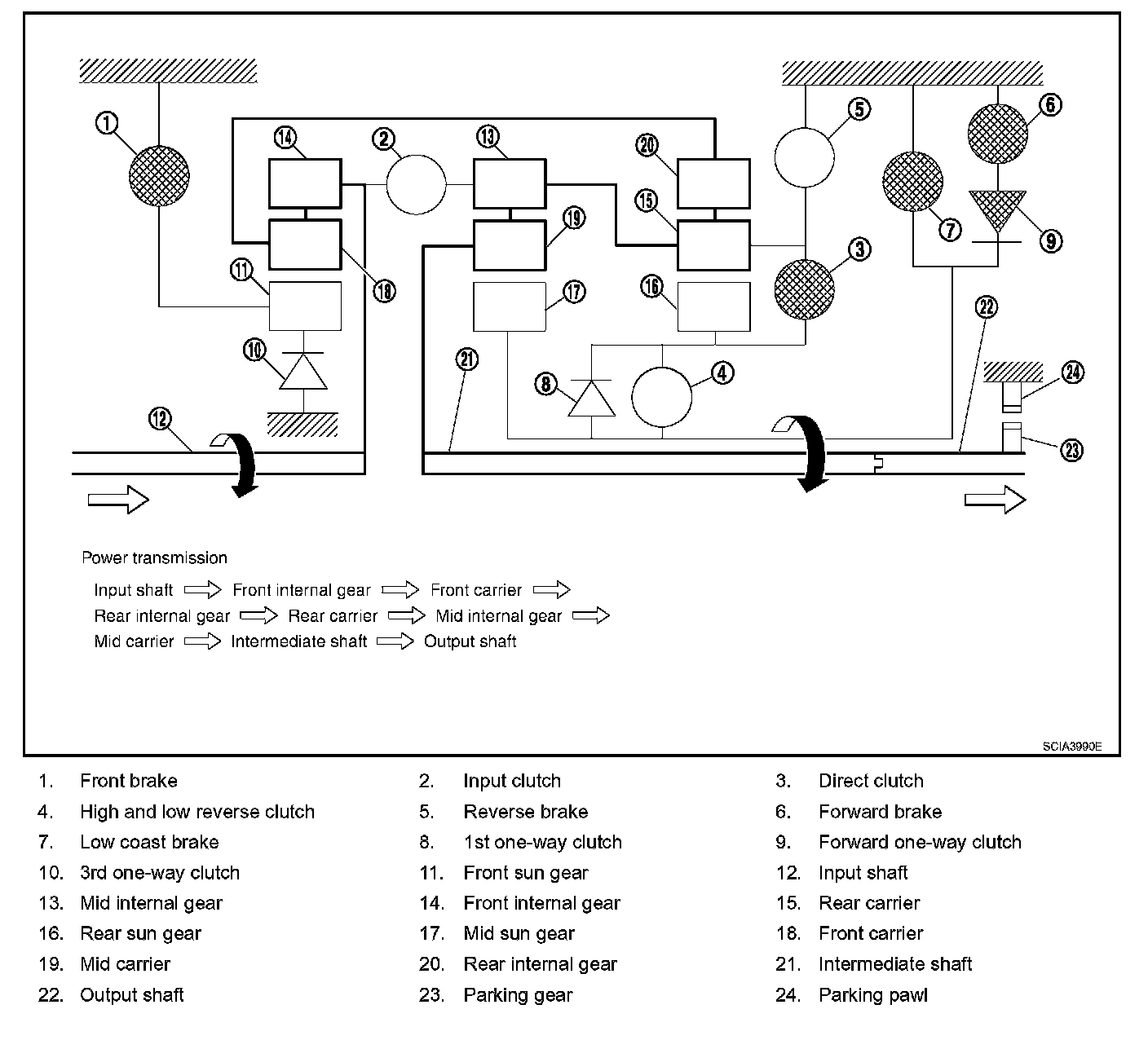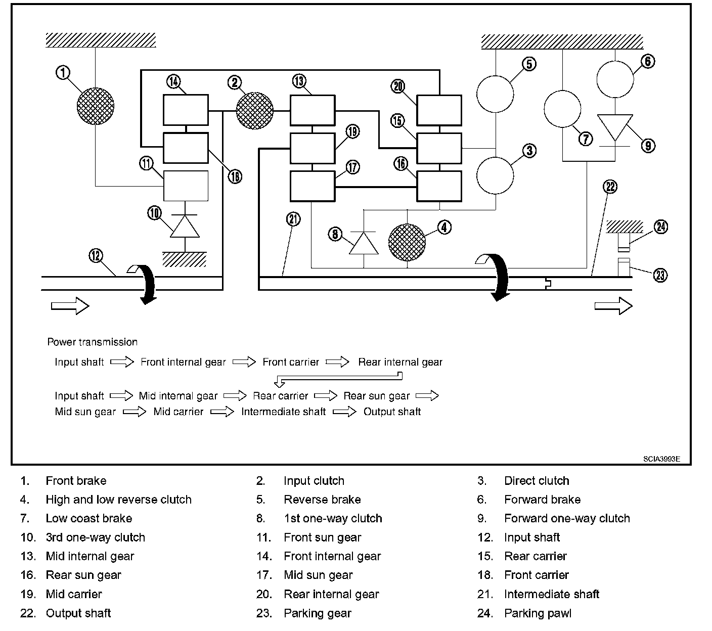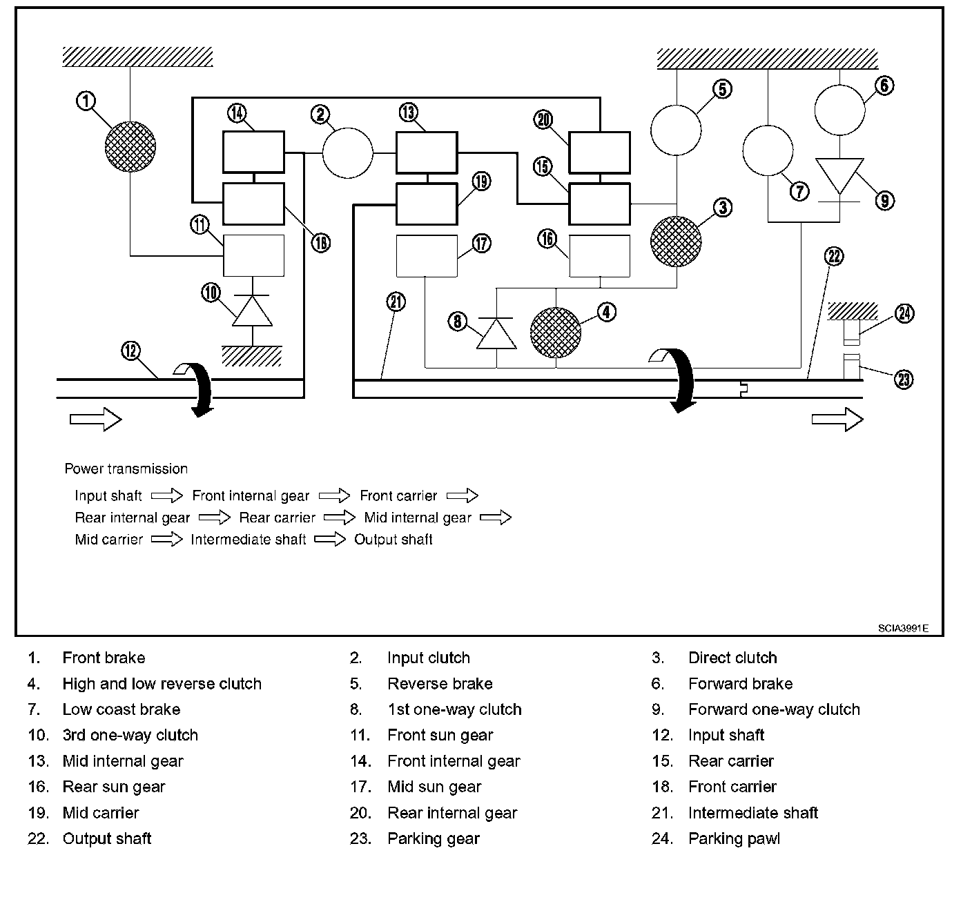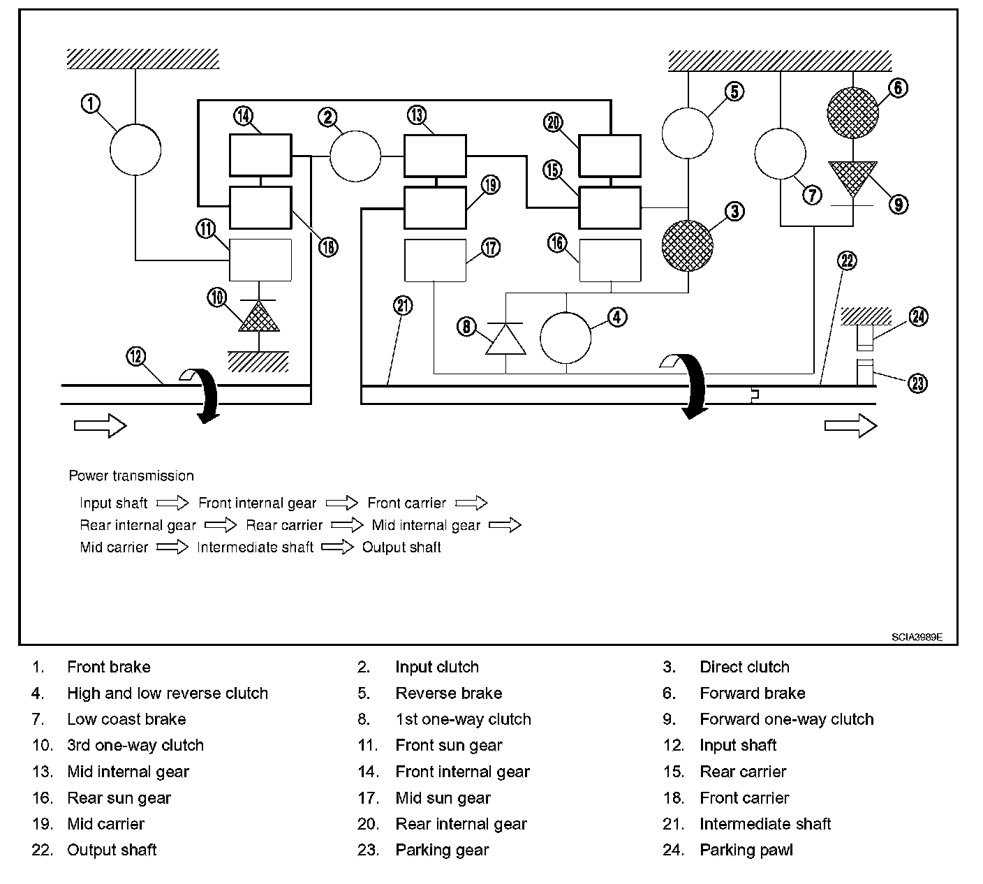 ^ The forward brake and the forward one-way clutch regulate reverse rotation of the mid sun gear.