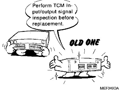 ^ Before replacing TCM, perform TCM input/output signal inspection and make sure whether TCM functions properly or not. "TCM INSPECTION TABLE".
