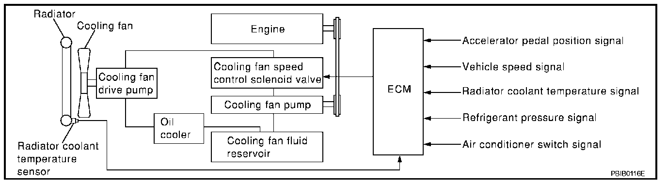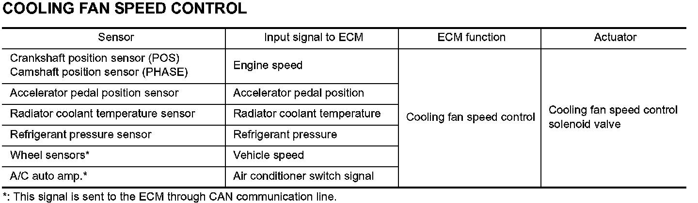 The ECM controls the cooling fan speed corresponding to the engine speed, the radiator coolant temperature, refrigerant pressure, vehicle speed, air conditioner switch signal, etc.