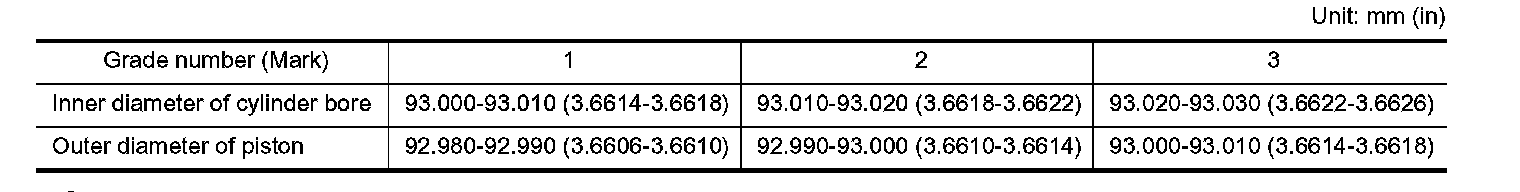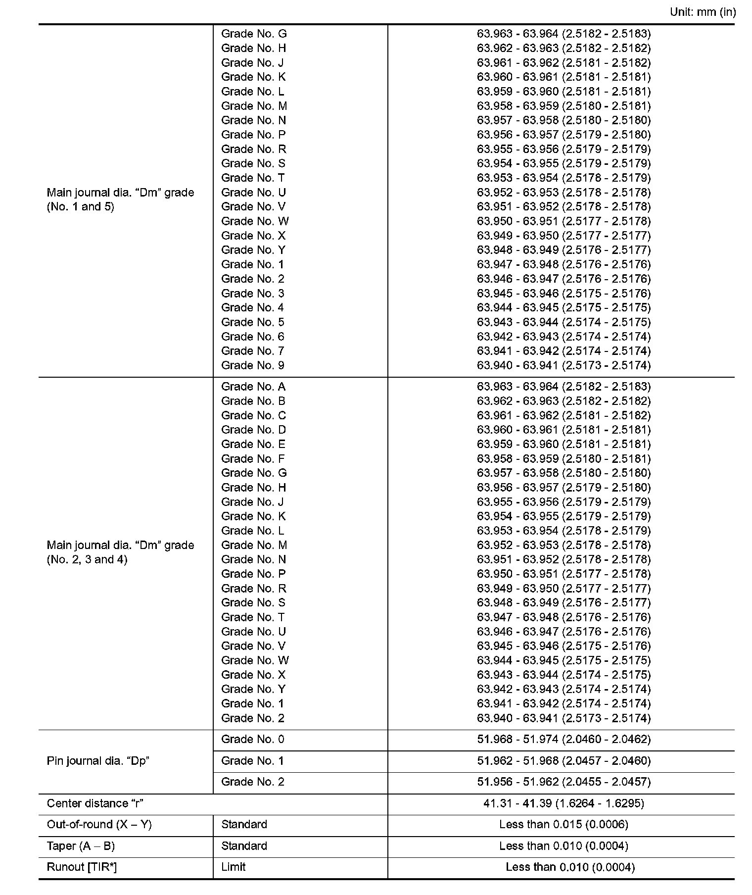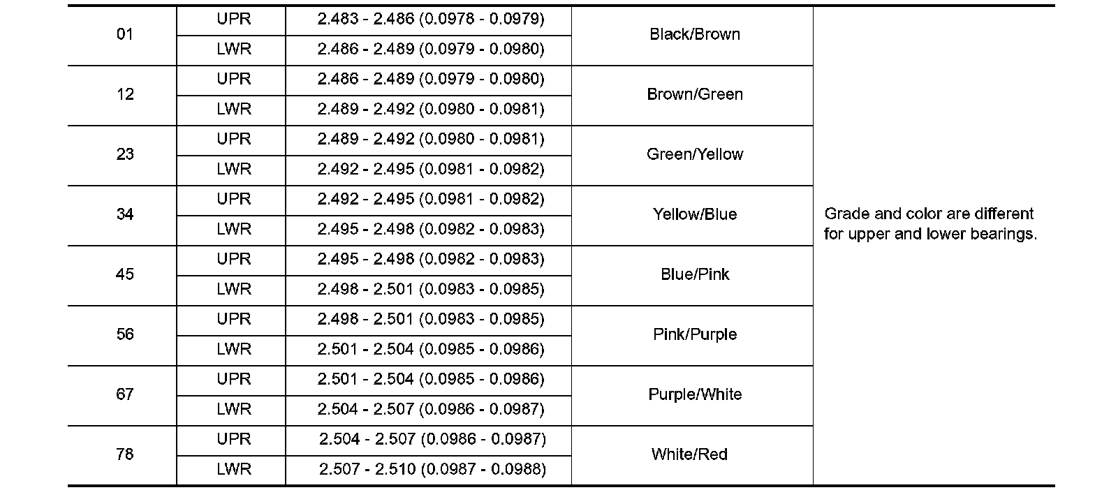 Main Bearings Grade Table (All Journals):