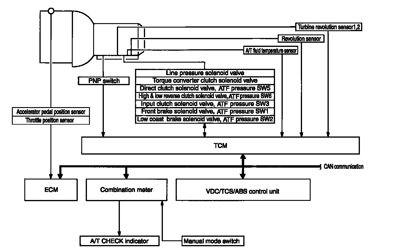 The automatic transmission senses vehicle operating conditions through various sensors or signals. It always controls the optimum shift position and reduces shifting and lock-us shocks.