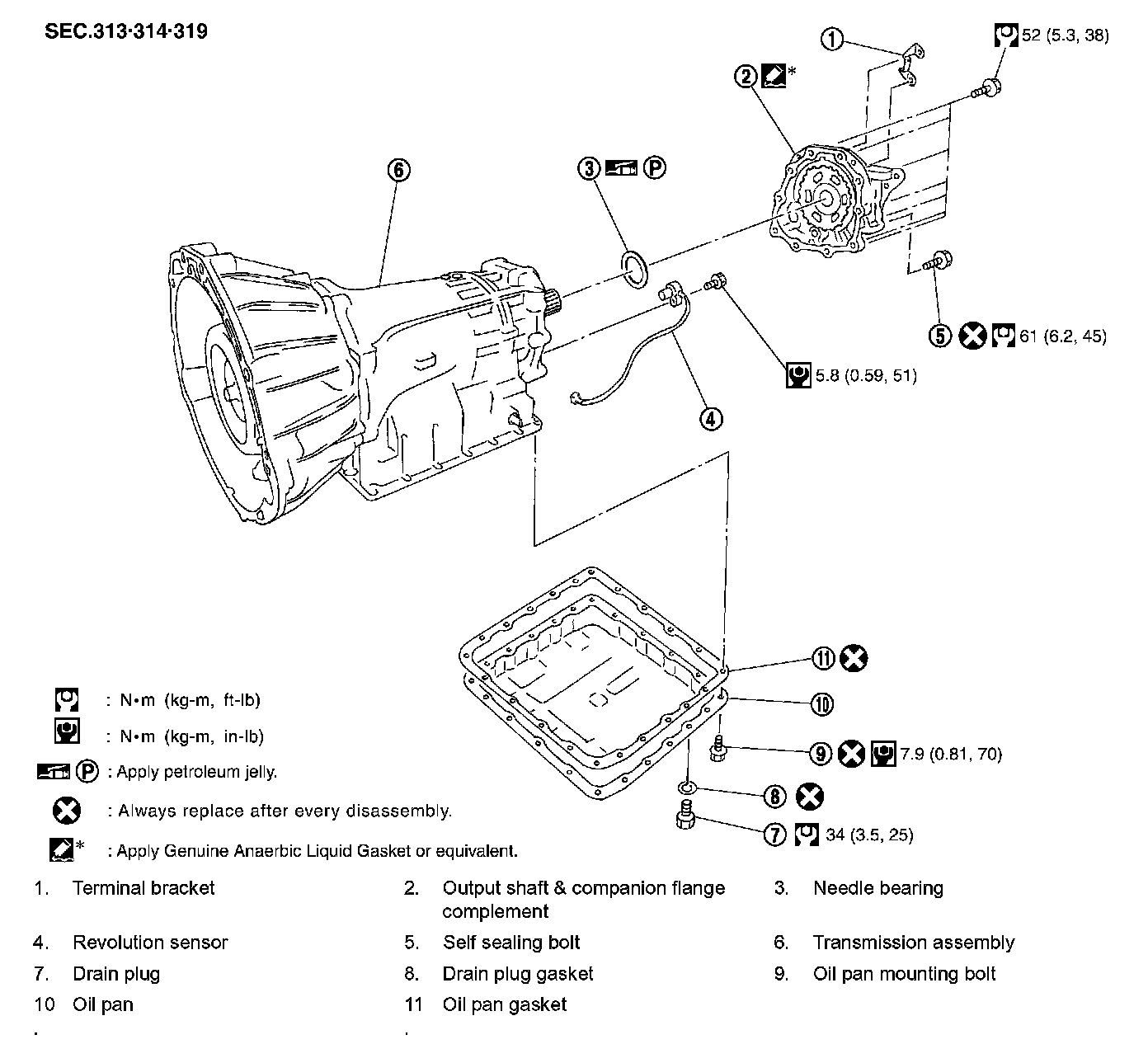 Output shaft & companion flange complement mounting bolt: 52 Nm (5.3 kg-m, 38 ft. lbs.)