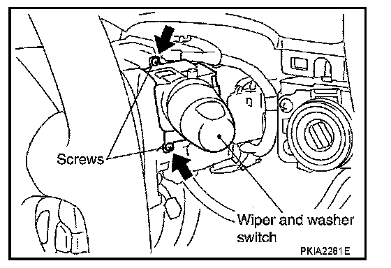 3. Pull wiper and washer switch toward the passenger door while removing screws in direction shown by the arrow in the figure, and remove it from the base.