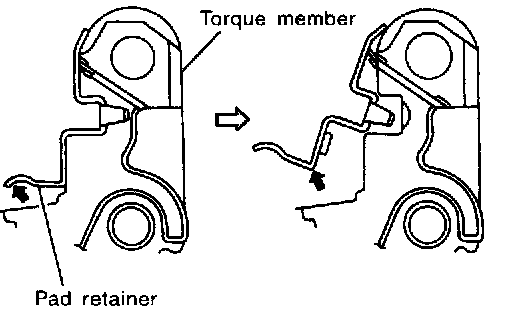 CAUTION: When removing pad retainer from torque member, lift pad retainer in the direction shown by arrow (shown in the figure) so as not to deform it.