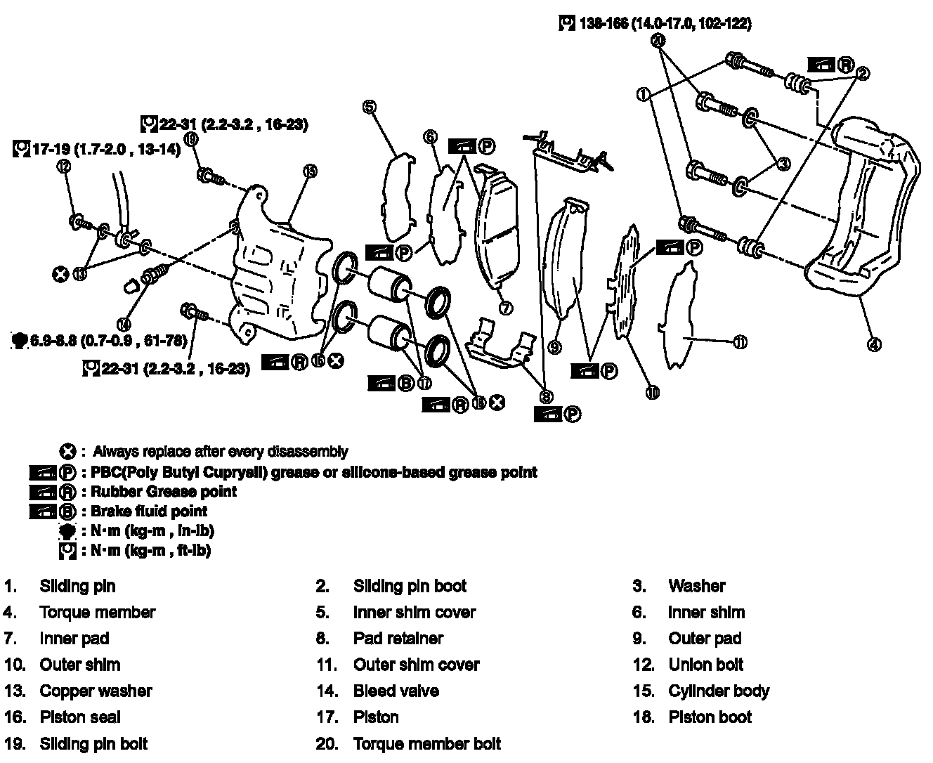 2. Apply disc brake grease to pad contact surface on pad retainer, and install pad retainers and pads to torque member.