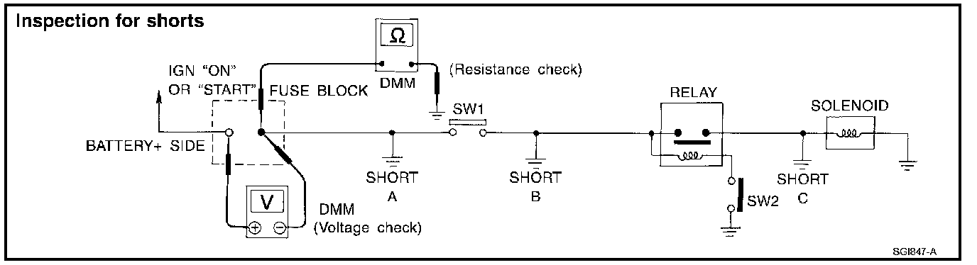 - Connect the other probe to the fuse block (power) side of SW1. Little or no resistance will indicate that portion of the circuit has good continuity. If there were an open in the circuit, the DMM would indicate an over limit or infinite resistance condition. (point A)