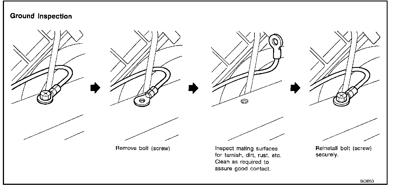 To inspect components under the hood, start by verifying the integrity of ground connections. (Refer to Ground Inspection described later.) First check that the system is properly grounded. Then check for loose connection by gently shaking the wiring or components as previously explained. Using the wiring diagrams inspect the wiring for continuity.