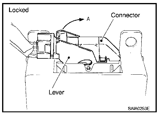 - For removal of the lever type connector, pull the lever up to the direction pointed to by the arrow A in the figure, and then remove the connector.