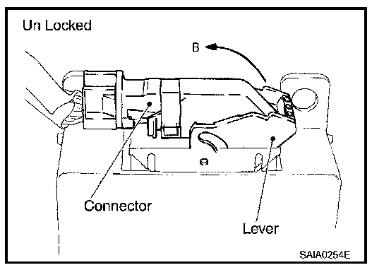 - For installation of the lever type connector, pull down the lever to the direction pointed by the arrow B in the figure, and then push the connector until a clicking noise is heard.