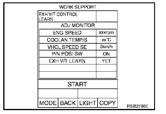 4. Select "EXH V/T CONTROL LEARN" in "WORK SUPPORT" mode with CONSULT-II.