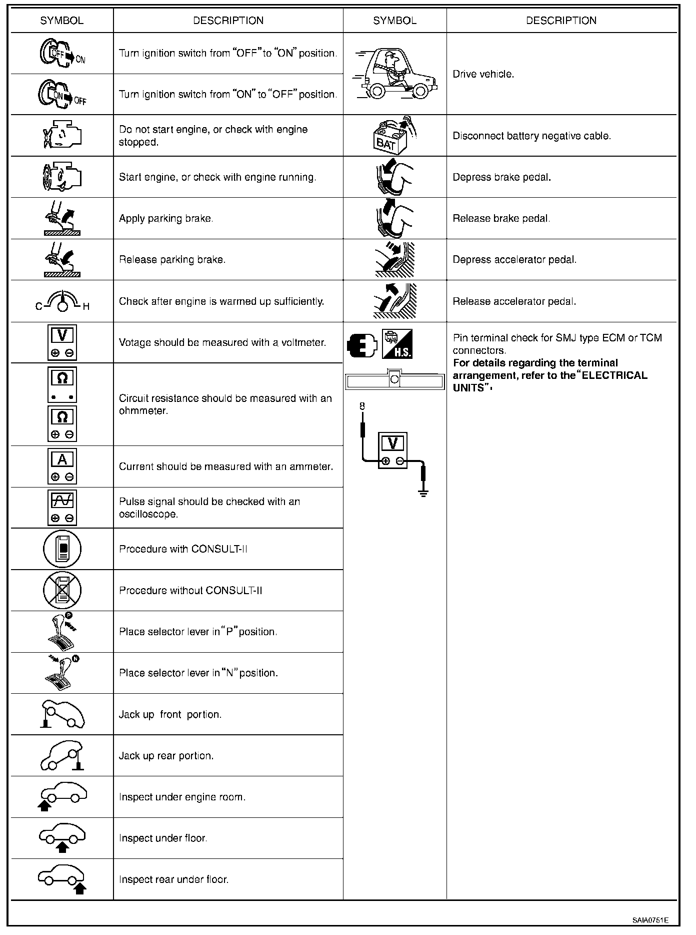 Symbols included in illustrations refer to measurements or procedures. Before diagnosing a problem, familiarize yourself with each symbol. Refer to "Connector Symbols" and "KEY TO SYMBOLS SIGNIFYING MEASUREMENTS OR PROCEDURES".