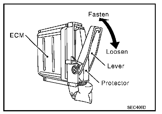 - When connecting ECM harness connector, fasten it securely with a lever as far as it will go as shown in the figure.