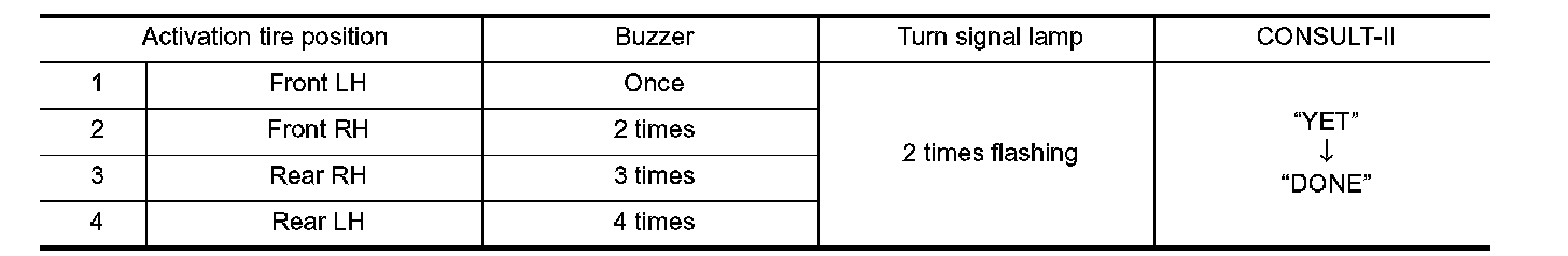 NOTE: Be sure to register the IDs in order from FR LH, FR RH, RR RH, to RR LH, or the self-diagnosis results display will not function properly