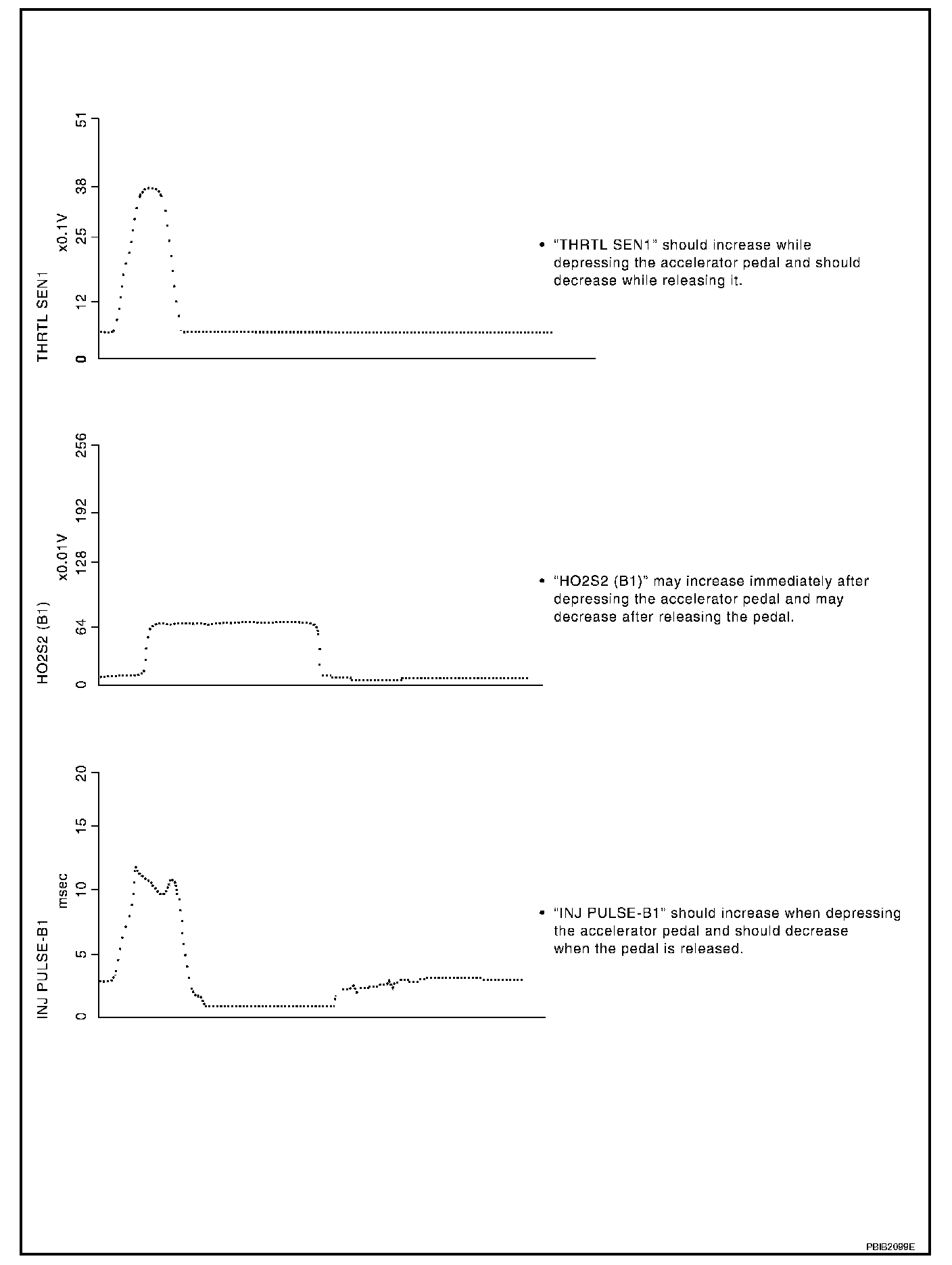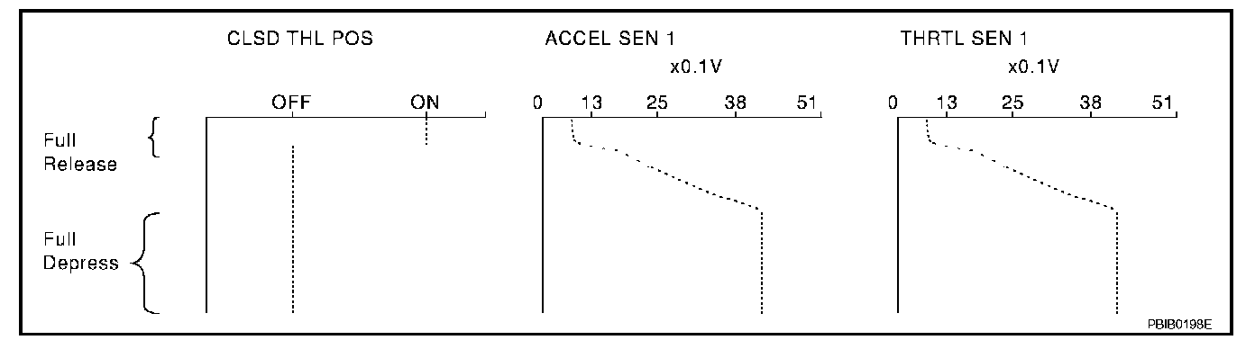 Below is the data for "CLSD THL POS", "ACCEL SEN 1" and "THRTL SEN 1" when depressing the accelerator pedal with the ignition switch ON and with selector lever in D position.
