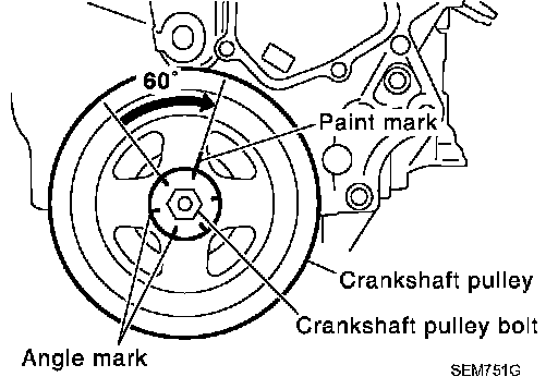 Put a paint mark on crankshaft pulley aligning with angle mark on crankshaft pulley bolt. Then, further retighten bolt by 60 degrees (Angle tightening).