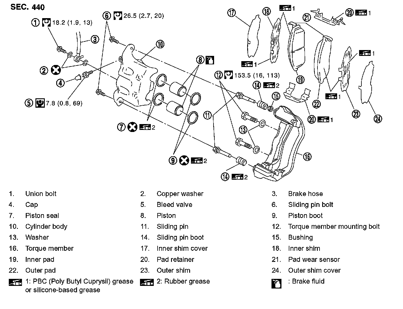 2. Apply PBC (Poly Butyl Cuprysil) grease or equivalent to between pad retainer and pad. Install pad retainers and pads to torque member.