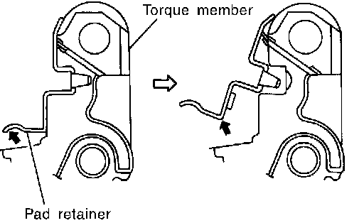 CAUTION: When removing the pad retainer from the torque member, lift it in the direction indicated by the arrow in the figure so that it does not deform.