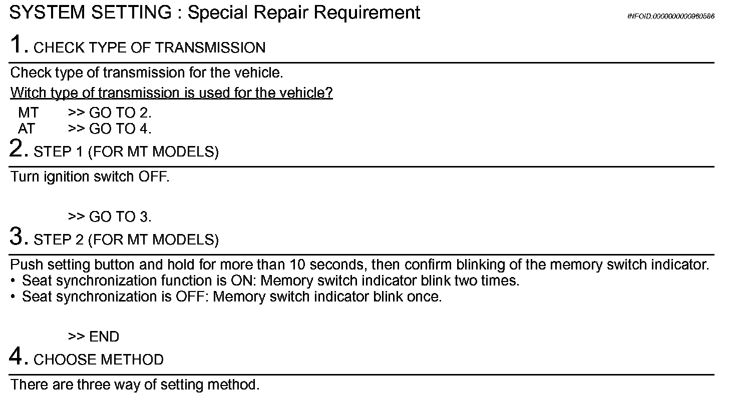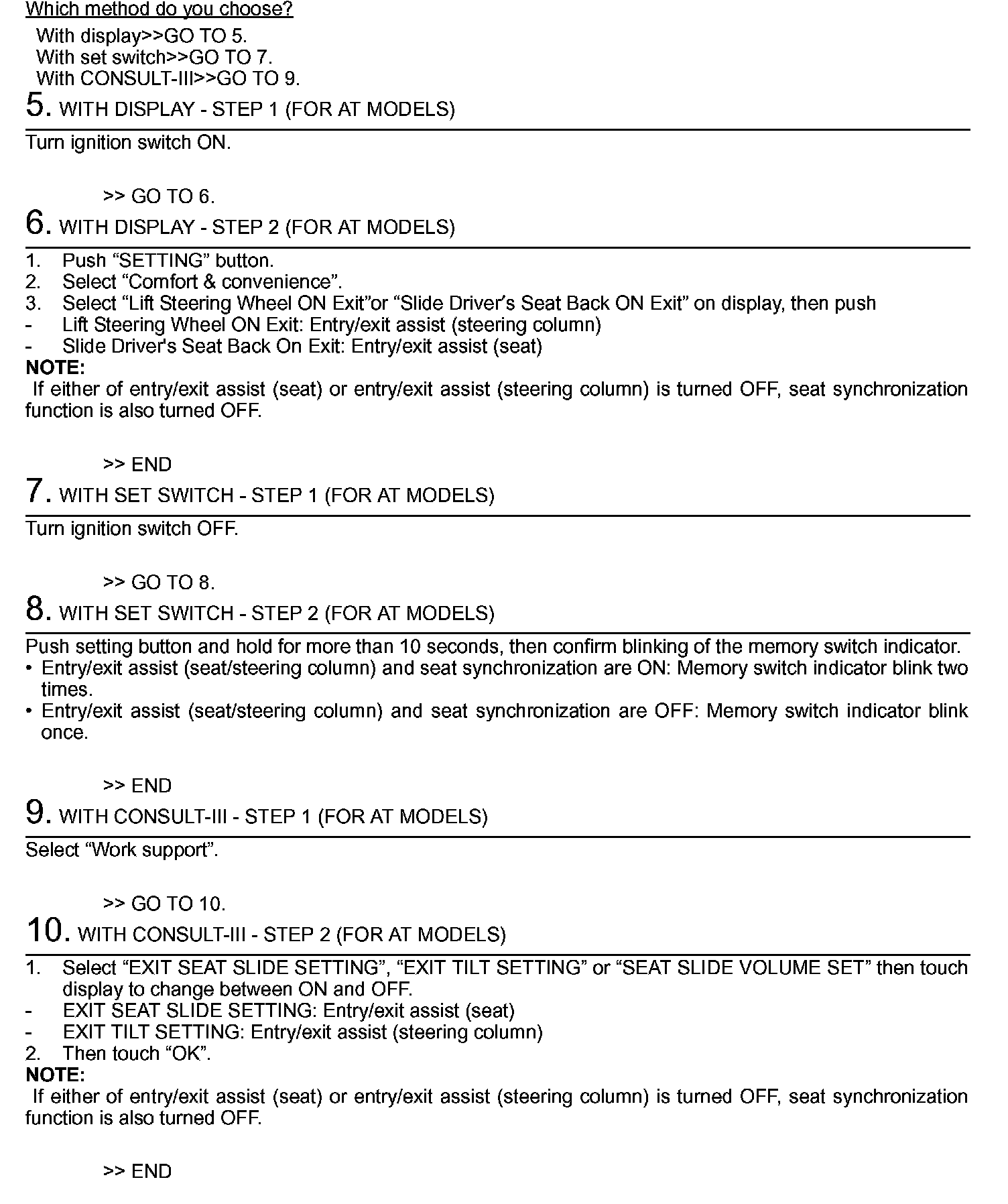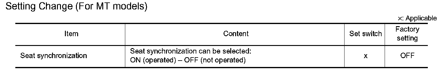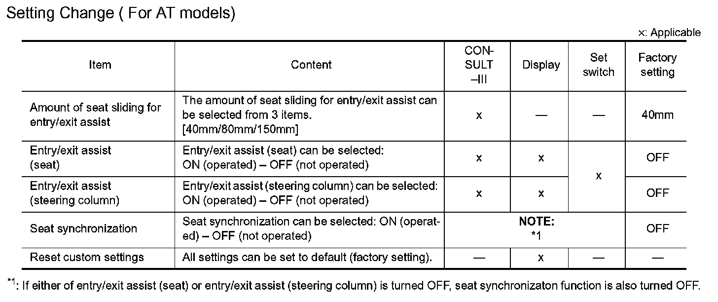 The settings of the automatic driving positioner system can be changed, using CONSULT-III, the display unit in the center of the instrument panel and the set switch. Always check the settings before and after disconnecting the battery terminal or replacing driver seat control unit.