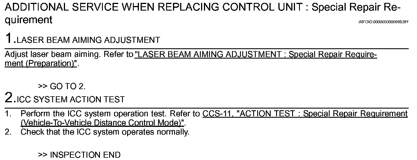 Always perform the laser beam aiming adjustment after replacing the ICC sensor integrated unit. In addition, test the ICC system operations to see if it functions normally.