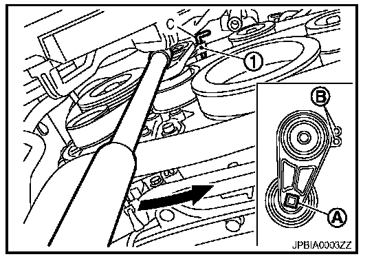 5. Under the above condition, insert a metallic bar of approximately 6 mm (0.24 in) in diameter [hexagonal wrench (C) shown as example in the figure] through the holding boss (B) to lock auto-tensioner pulley arm.