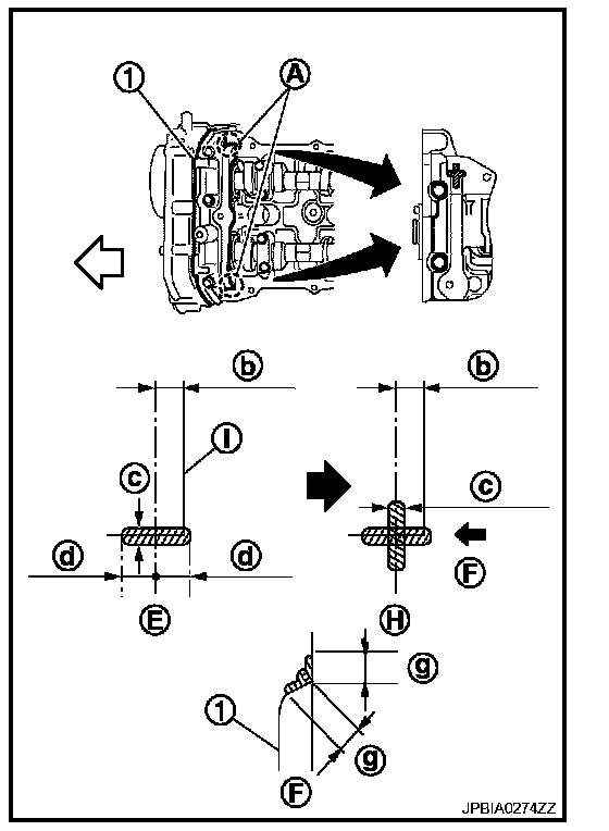 b. Refer to figure (H) to apply liquid gasket in 90° to figure. Use Genuine RTV silicone sealant or equivalent. Refer to GI-15, "Recommended Chemical Products and Sealants". Fluid Type Specifications