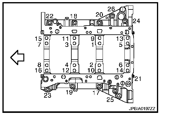 Main Bearing CapTighten lower cylinder block bolts (No. 1 to 16) in numerical order as shown in the figure.