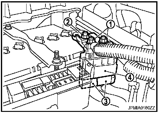 4. Remove fusible link holder mounting nut (2) to disconnect battery terminal with fusible link (4).