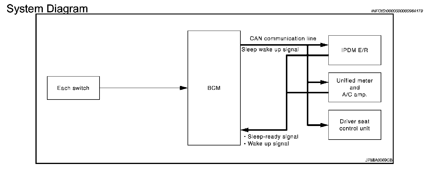 - IPDM E/R changes from the low power consumption mode to the normal mode when it receives a sleep wake-up signal (wake up) from BCM or any of the following conditions is fulfilled. In addition, it transmits a sleep-ready signal (not-ready) to BCM via CAN communication to report the CAN communication start.