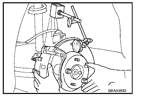 2. Inspect runout using a dial gauge. [Measured at 10 mm (0.39 in) inside the disc edge.]