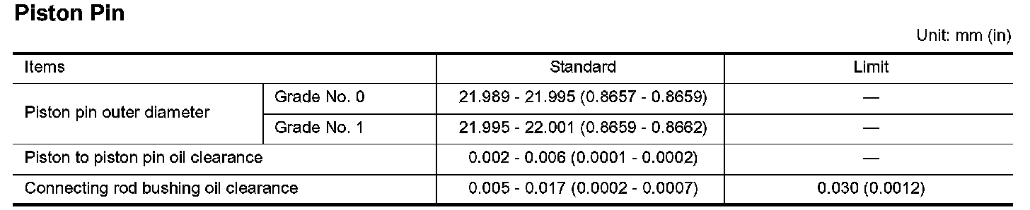 (Piston to piston pin oil clearance) = (Piston pin hole diameter) - (Piston pin outer diameter)