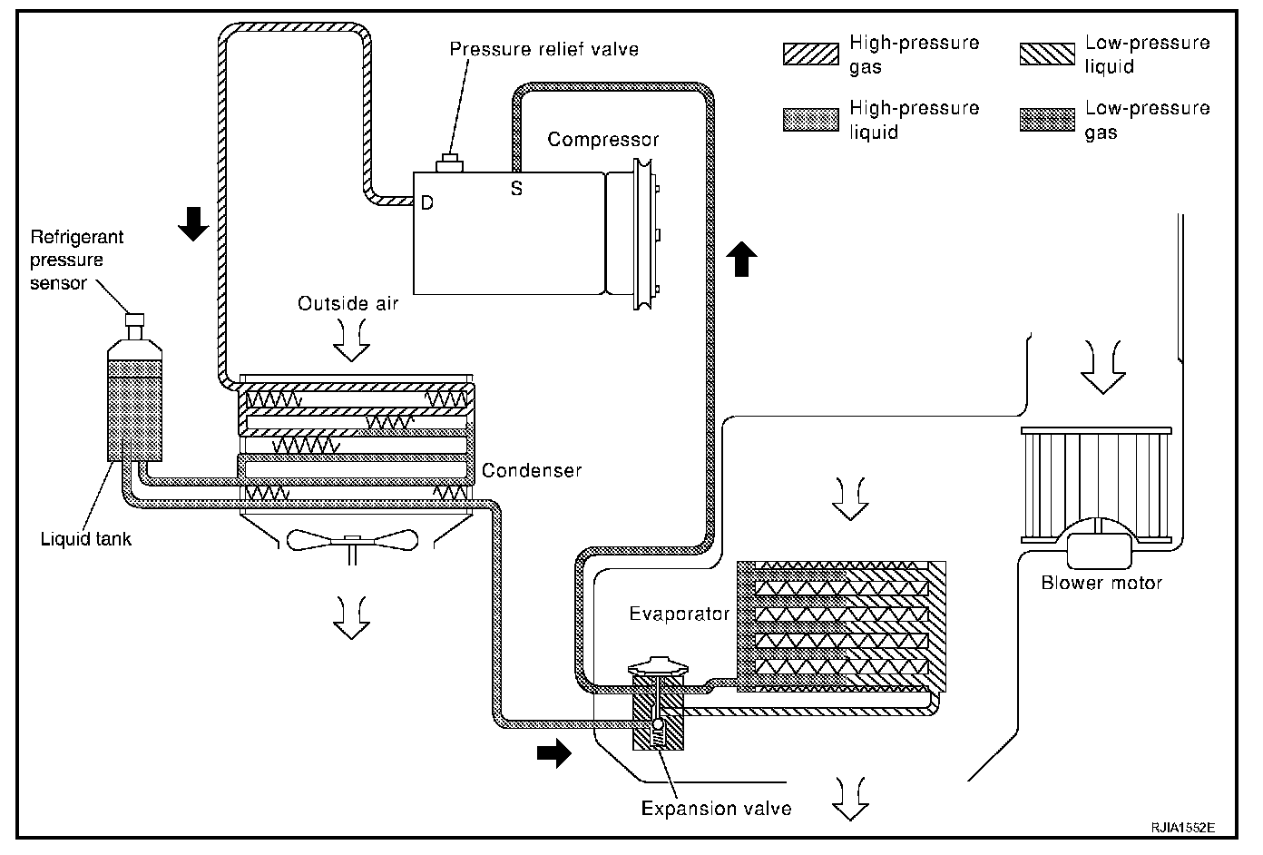 The refrigerant system is protected against excessively high- or low-pressures by the refrigerant pressure sensor, located on the liquid tank. If the system pressure rises above, or falls below the specifications, the refrigerant pressure sensor detects the pressure inside the refrigerant line and sends the voltage signal to the ECM. ECM makes the A/C relay go OFF and stops the compressor when pressure on the high-pressure side detected by refrigerant pressure sensor is over about 3,119 kPa (31.8 kg/sq.cm, 452 psi), or below about 118 kPa (1.2 kg/sq.cm, 17 psi).