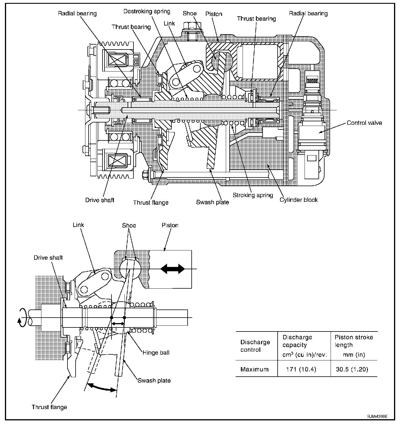 The tilt of the swash plate allows the piston's stroke to change so that refrigerant discharge continuously change from approx. 0 to 171 cu.cm (0 to 10.4 cu in).
