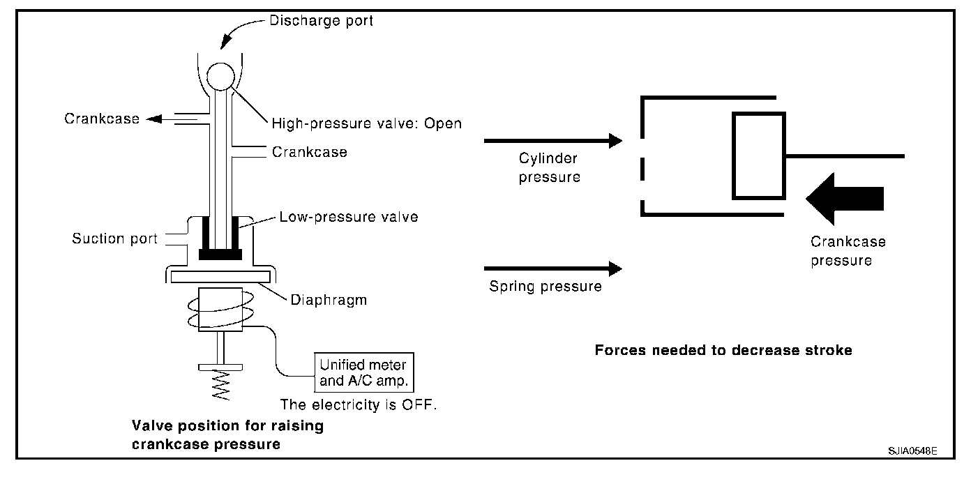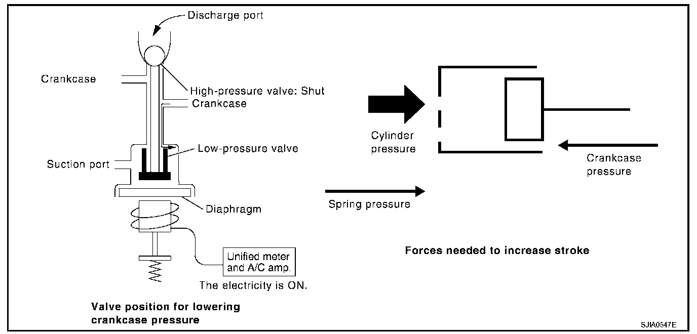 High-pressure valve is closed by magnetic force generated by electric signal sent from unified meter and A/C amp. At this time, cylinder moves full stroke due to pressure balance between inside crankcase (Pc) and suction line (Ps).