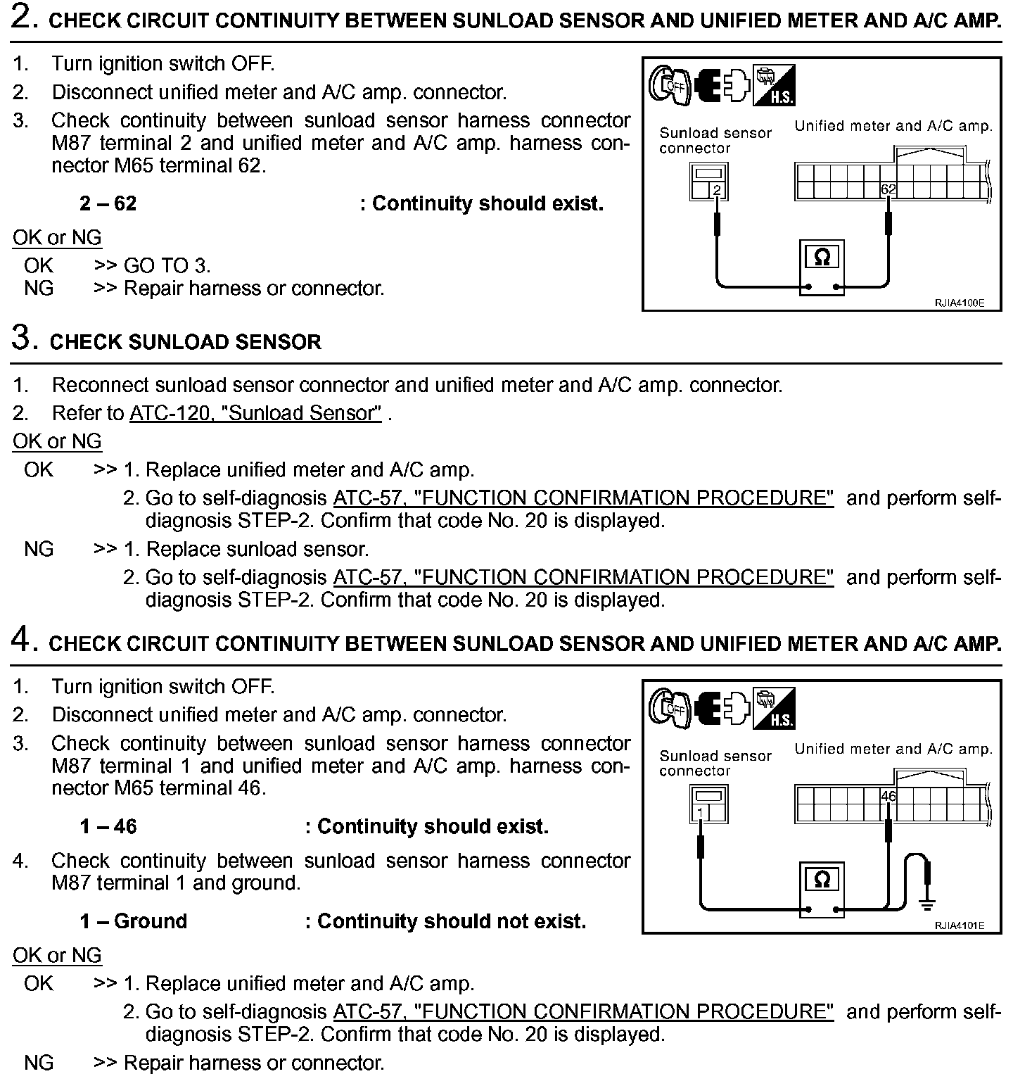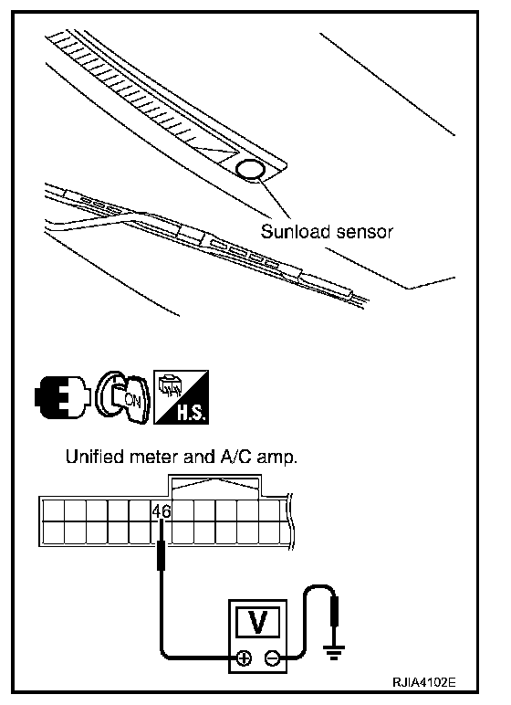 SYMPTOM: Sunload sensor circuit is open or shorted. (25 or -25 is indicated on unified meter and A/C amp. as a result of performing self-diagnosis STEP-2.)