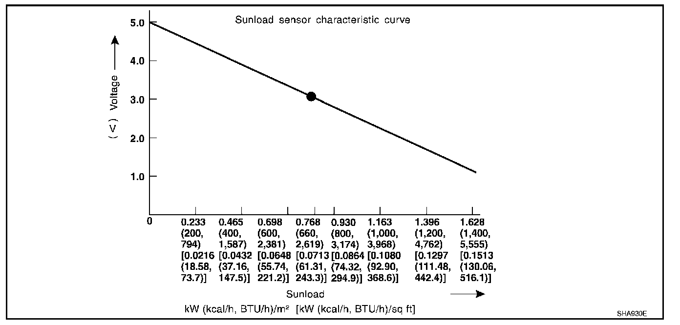 The sunload sensor is located on the driver's side front defroster grille. It detects sunload entering through windshield by means of a photo diode. The sensor converts the sunload into a current value which is then input into the unified meter and A/C amp.