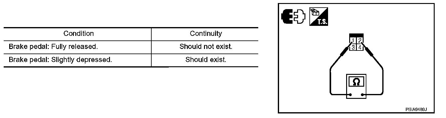 3. Check harness continuity between stop lamp switch terminals 1 and 2 under the given conditions.