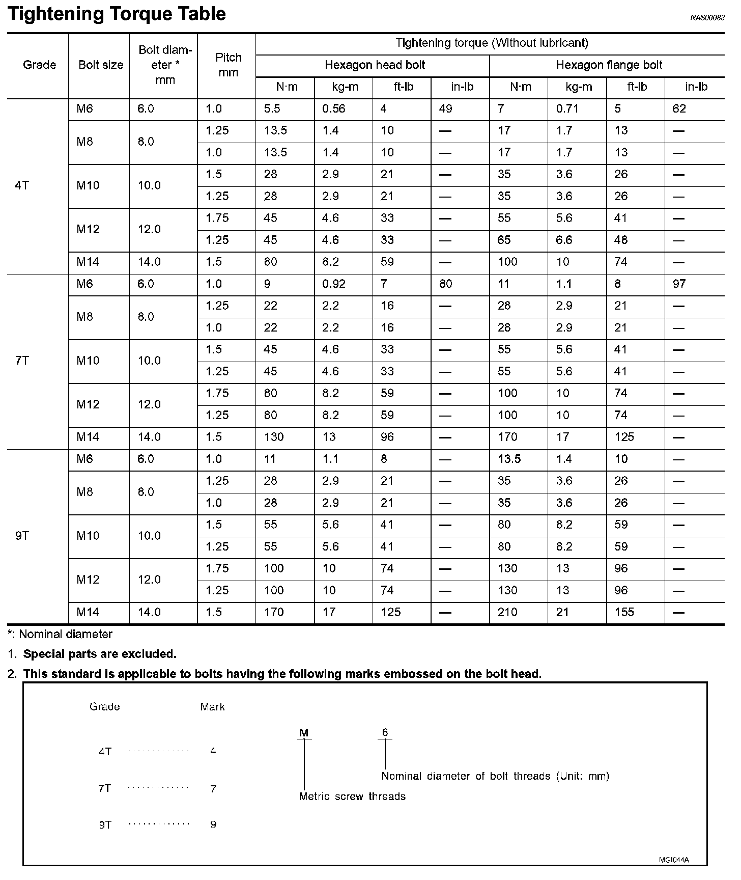 Tightening Torque Of Standard Bolts: