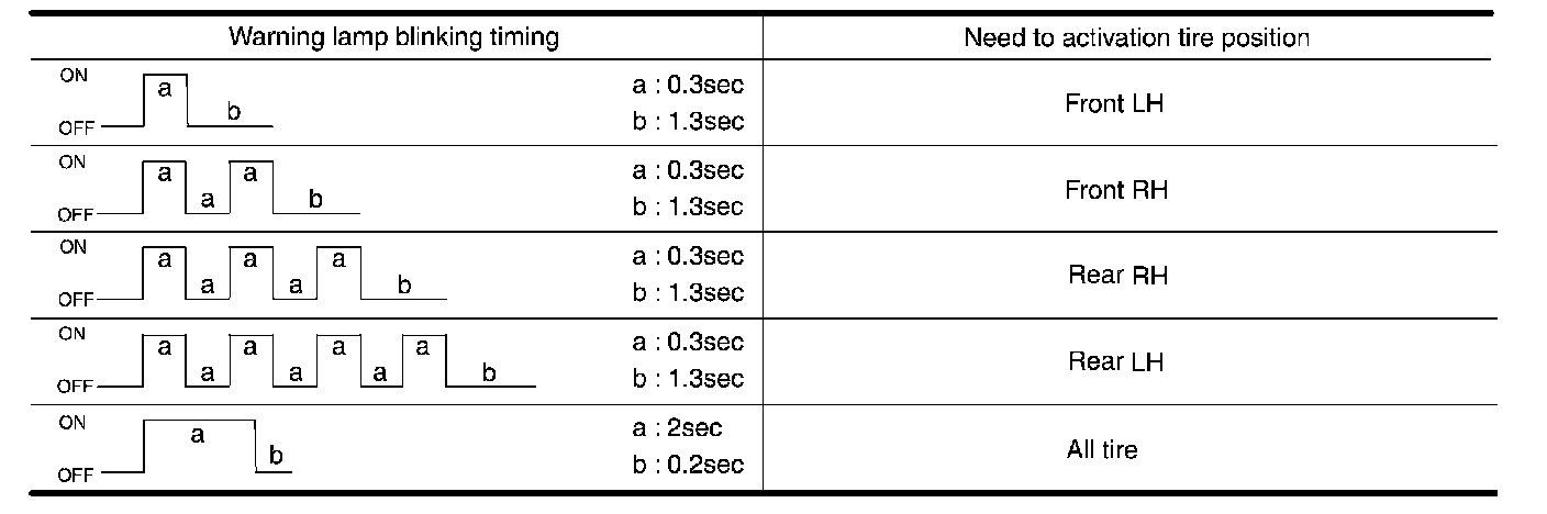 ^ When ignition switch ON, as the low tire pressure warning lamp blinks per the follow diagram, the respective transmitter then must be wake up.