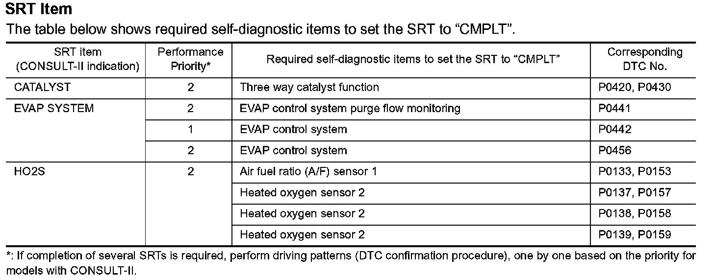 To set all SRT codes, self-diagnosis for the items indicated above must be performed one or more times. Each diagnosis may require a long period of actual driving under various conditions.