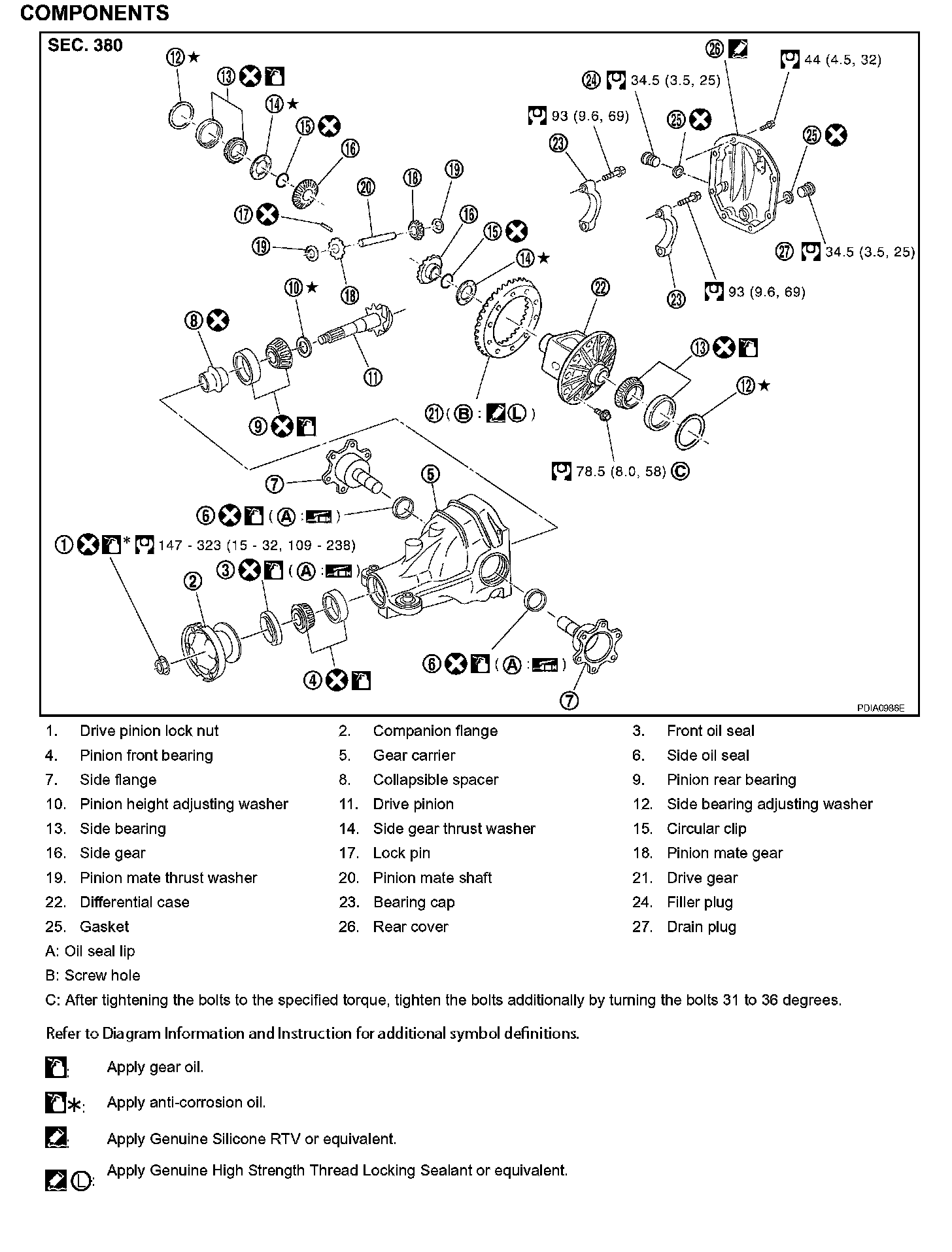 Drive pinion lock nut tightening torque: 147 - 323 Nm (15 - 32 kg-m, 109 - 238 ft-lb)