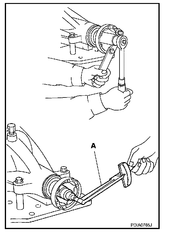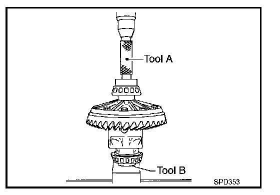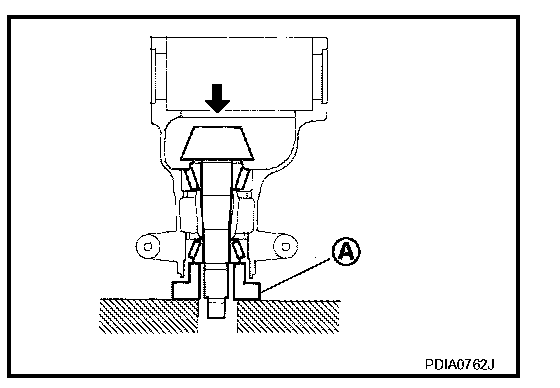 7. Using suitable spacer (A), press the pinion front bearing inner race to drive pinion as far as drive pinion nut can be tightened.
