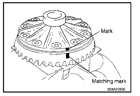 7. Align the matching mark of differential case with the mark of drive gear, then place drive gear.