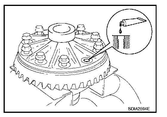 9. Install drive gear on the mounting bolts, and then tighten to the specified torque. Refer to Exploded View RFD-18.