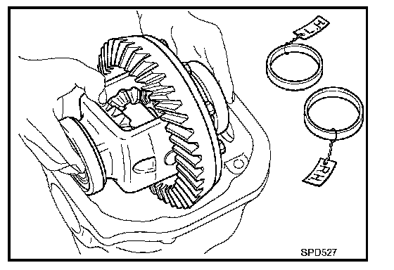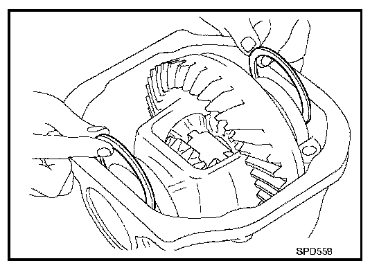 1. Install side gear thrust washers with the same thickness as the ones installed prior to disassembly or reinstall the old ones on the side gears.