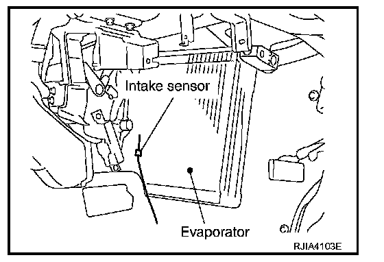 The intake sensor is located on the heater & cooling unit assembly. It converts temperature of air after it passes through the evaporator into a resistance value which is then input to the unified meter and A/C amp.