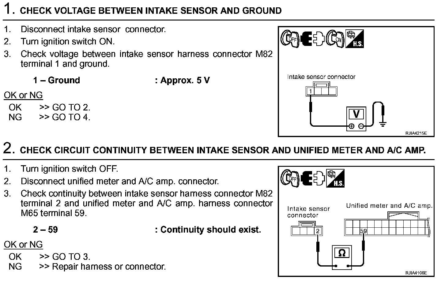 After disconnecting intake sensor connector M82, measure resistance between terminals 1 and 2 at sensor side. Refer to the table.